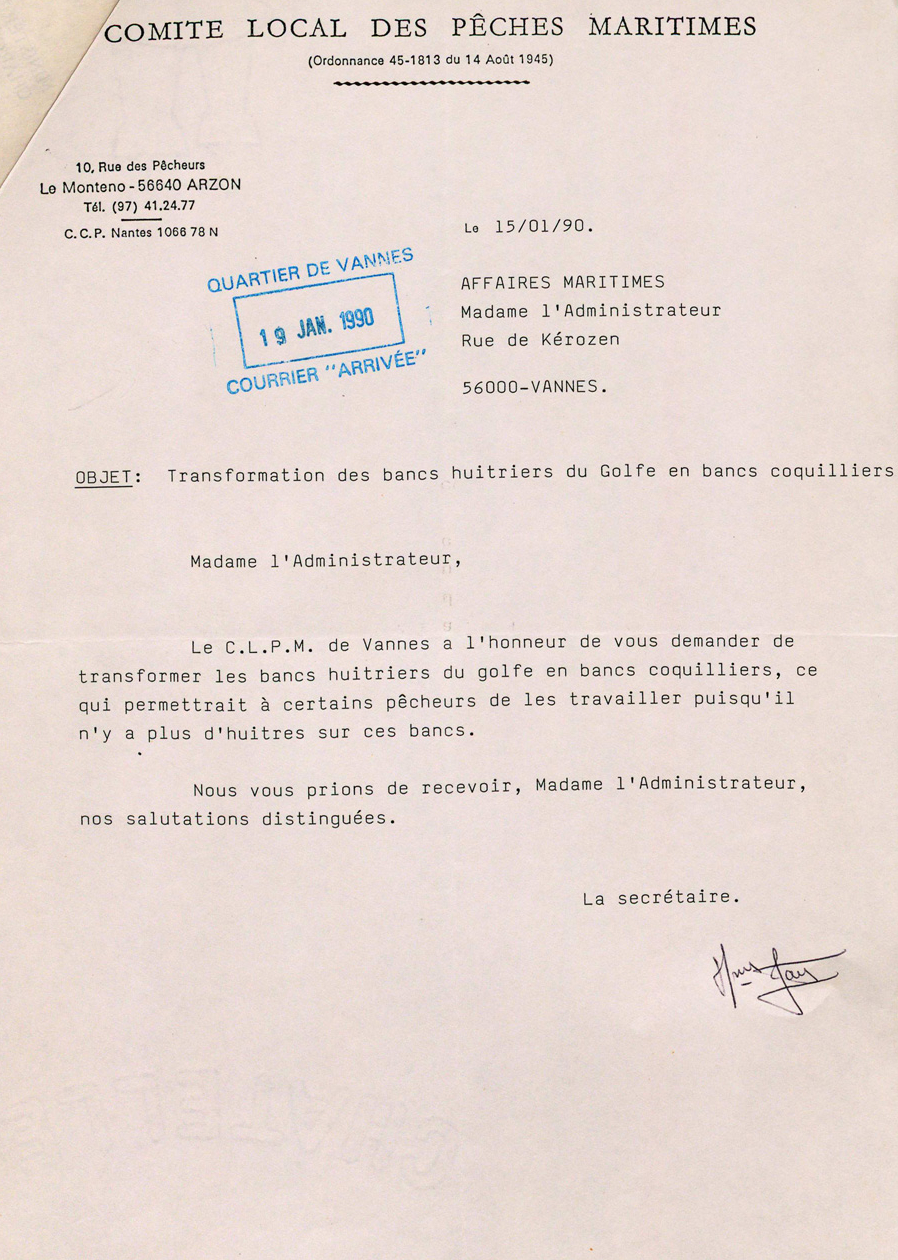 Courrier du comité des pêches pour la demande de transformation des bancs huîtriers en bancs coquillers - janvier 1990 -