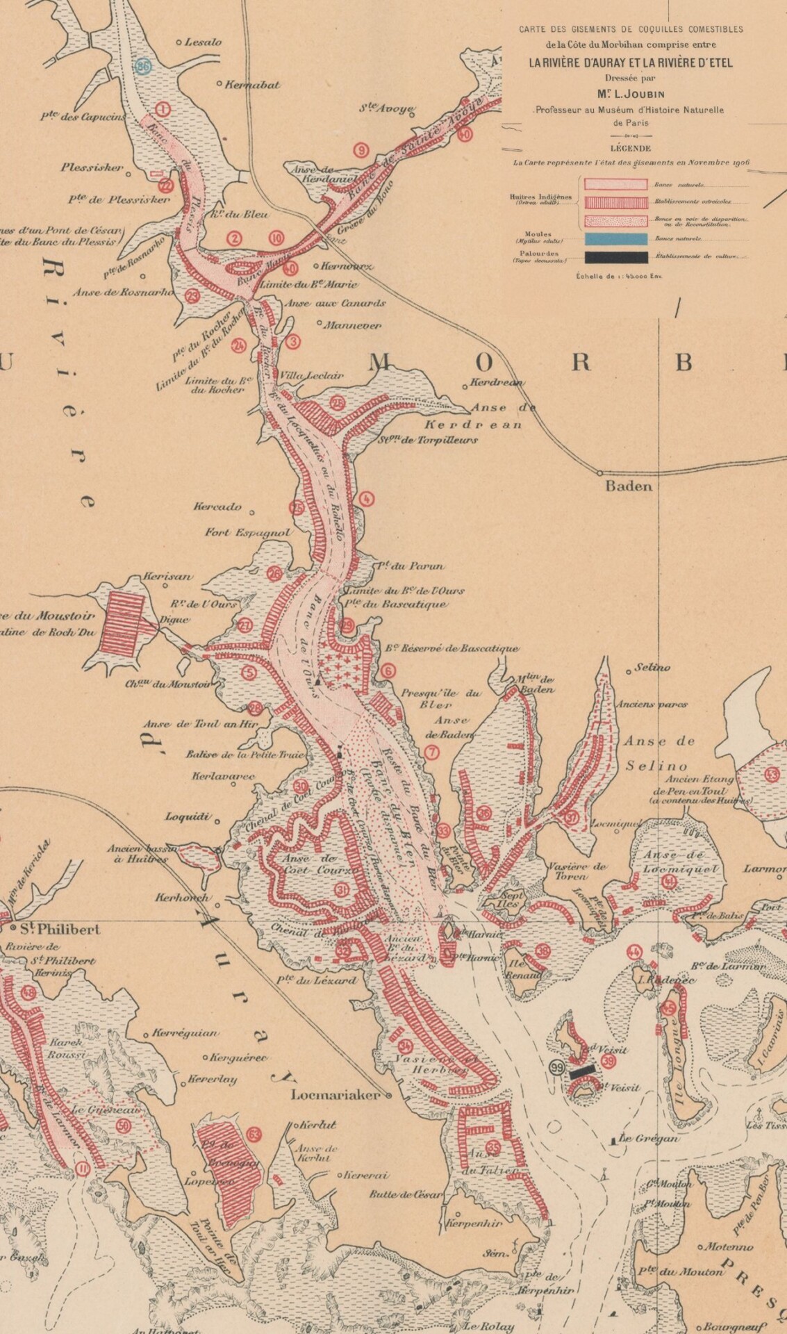 Extrait de la carte des gisements d'huitres plates en Rivière d'Auray par L. Joubin - 1906 -