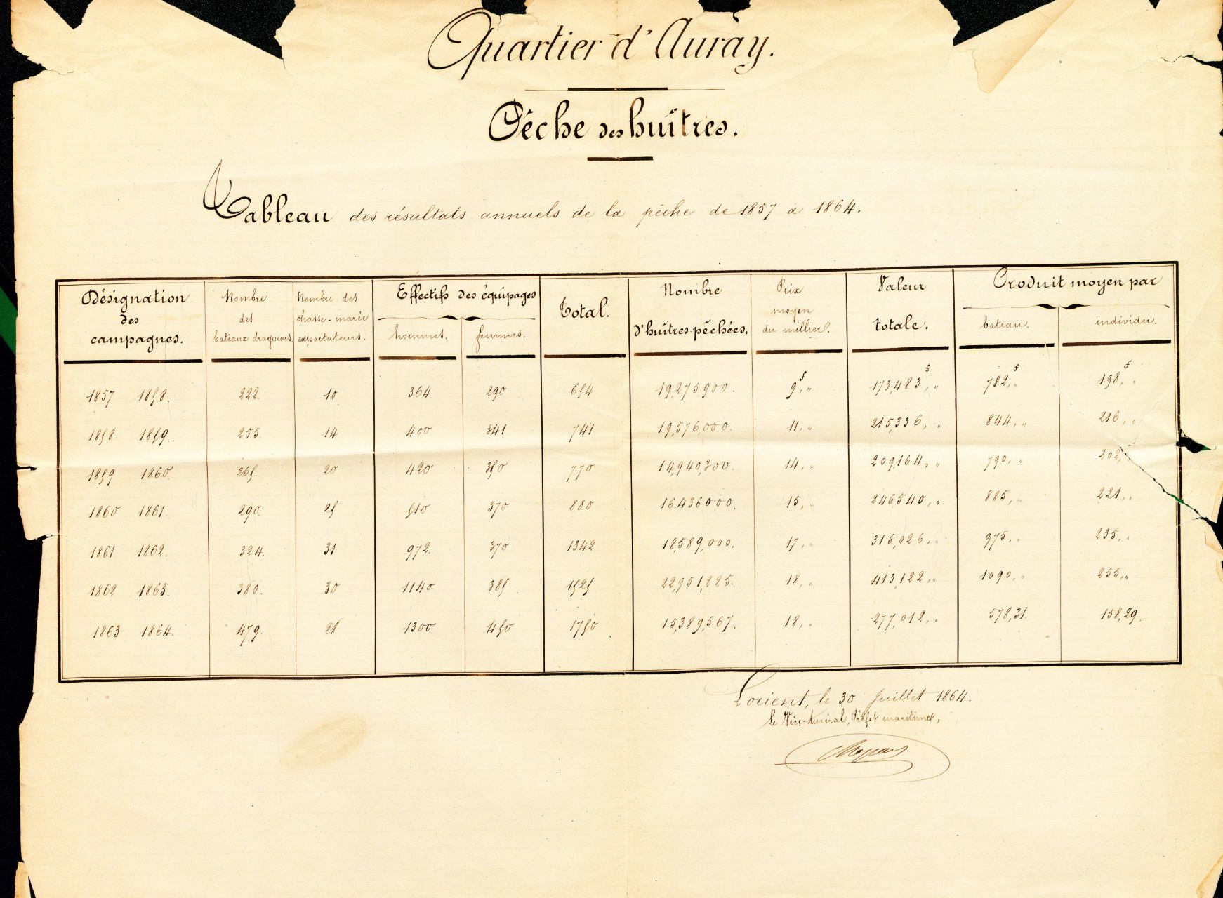 Tableau de recensement de la pêche aux huîtres plates en rivière d'Auray de 1857 à 1864 (Crédit : AD56) -